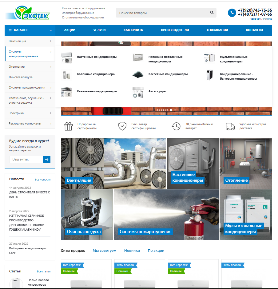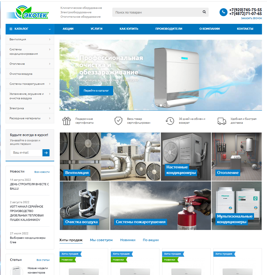 Сайт для компании ООО "Экотек" представляет интернет-магазин с качественно проработанными детальными страницами товаров, на которых выведены основные информация и характеристики товара, приведены технические сведения о продукции.
